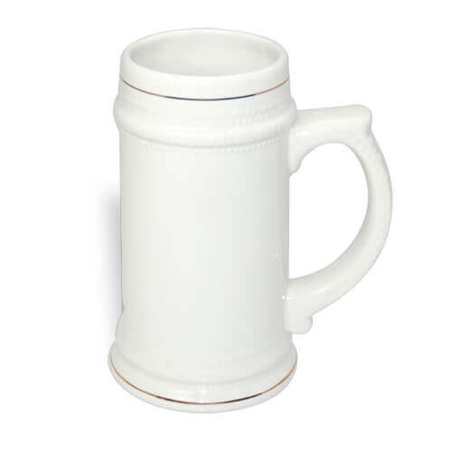 Boccale bianco in ceramica della classe A+ /vedi le differenze con altre classi di ceramica/, con striscia dorata, trattato con poliestere per renderlo adatto alla stampa a sublimazione. Possibilità di acquisto di un pezzo.