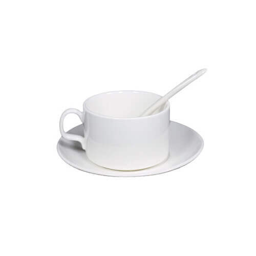 Tazzina bianca con piattino e cucchiaino, della classe A+ /vedi le differenze con altre classi di ceramica/, trattata con poliestere per renderla adatta alla stampa a sublimazione. Possibilità di acquisto di un pezzo. La stampa viene eseguita solo su una tazzina. Impaccata in una scatola che durante trasporto potrà subire piccole macchie e schiacciamenti.