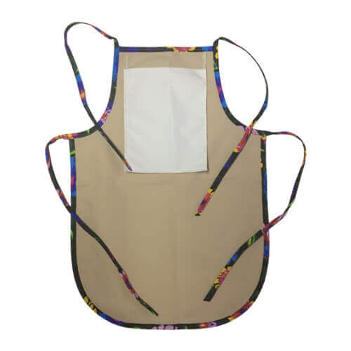 Grembiule per bambini di colore beige con tasca bianca per la stampa in tecnologia di sublimazione.