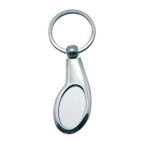 Portachiavi in metallo di colore argento per la stampa a sublimazione. La stampa viene effettuata su una placca metallica, fornita insieme al portachiavi, che va incollata all’area fresata del portachiavi. Il portachiavi è confezionato in una scatola decorativa nera con inserto nero che imita il velluto per tenere fermo il portachiavi. Il prodotto finito può diventare un regalo originale etc.