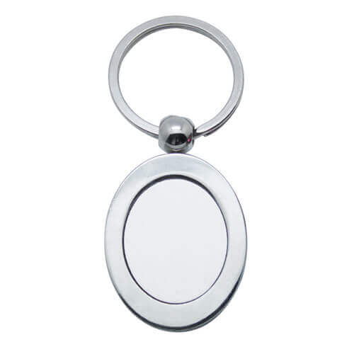 Portachiavi in metallo di colore argento per la stampa a sublimazione. La stampa viene effettuata su una placca metallica, fornita insieme al portachiavi, che va incollata all’area fresata del portachiavi. Il portachiavi è confezionato in una scatola decorativa nera con inserto nero che imita il velluto per tenere fermo il portachiavi. Il prodotto finito può diventare un regalo originale etc.