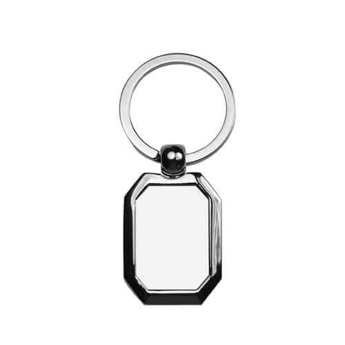Portachiavi in metallo di colore argento per la stampa a sublimazione. La stampa viene effettuata su una placca metallica, fornita insieme al portachiavi, che va incollata all’area fresata del portachiavi. Il portachiavi è confezionato in una scatola decorativa nera con inserto nero che imita il velluto per tenere fermo il portachiavi. Il prodotto finito può diventare un regalo originale etc.