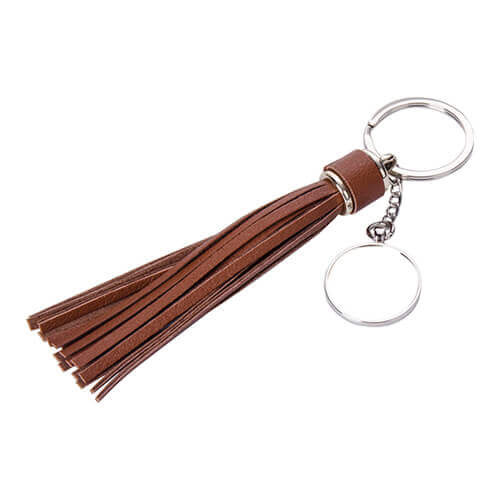 Portachiavi per la stampa a sublimazione. Portachiavi in metallo con frange lunghe. La stampa viene effettuata su una placca metallica, fornita insieme al portachiavi, che va incollata all’area fresata del portachiavi. Il portachiavi è confezionato in una scatola decorativa con inserto nero che imita il velluto per tenere fermo il portachiavi. Il prodotto finito può diventare un regalo originale etc.