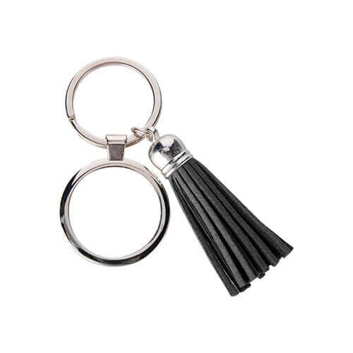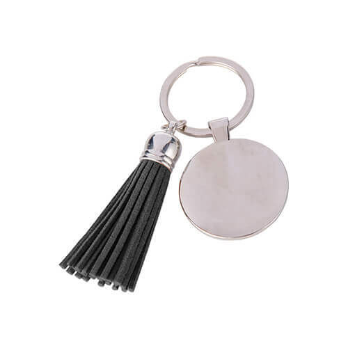 Portachiavi per la stampa a sublimazione. Portachiavi in metallo con frange corte. La stampa viene effettuata su una placca metallica, fornita insieme al portachiavi, che va incollata all’area fresata del portachiavi. Il portachiavi è confezionato in una scatola decorativa con inserto nero che imita il velluto per tenere fermo il portachiavi. Il prodotto finito può diventare un regalo originale etc.