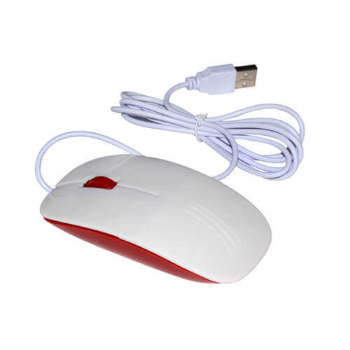 Una mause per la stampa 3D in tecnologia di sublimazione. La mause ottica con due tasti e una rotella. La stampa viene eseguita sulla parte superiore, plastica del mouse. Cavo USB.