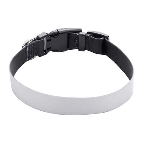 Collare per cane per stampa a sublimazione. Collare con diametro regolabile, si aggancia con una fibbia in plastica, con anello di metallo per agganciare il guinzaglio. La stampa è realizzata sulla parte bianca del colletto.