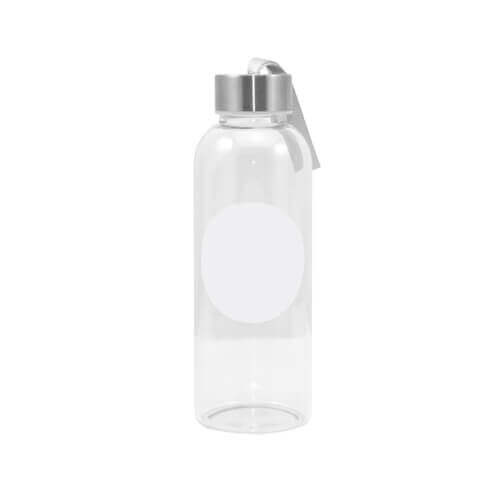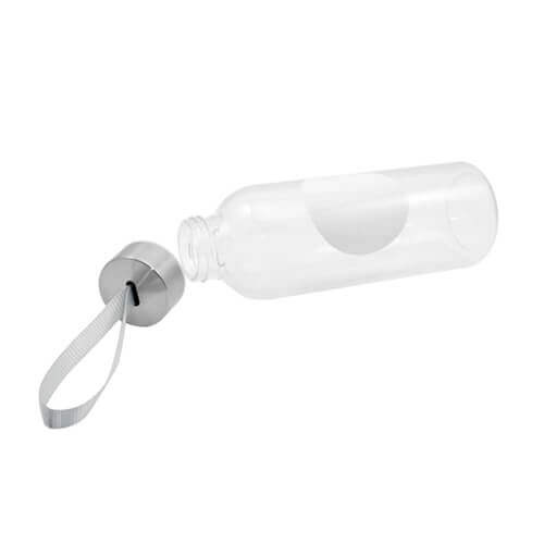 Borraccia di vetro da 420 ml con cornice rettangolare da sublimare. Bottiglia con tappo di metallo con un nastrino.