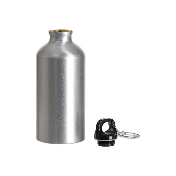 Borraccia da viaggio con una capacità di 400 ml rivestita con uno strato di poliestere da sublimare. Il corpo della borraccia è realizzato in alluminio con coperchio svitabile con moschettone che consente di fissarla ad esempio ad uno zaino.
