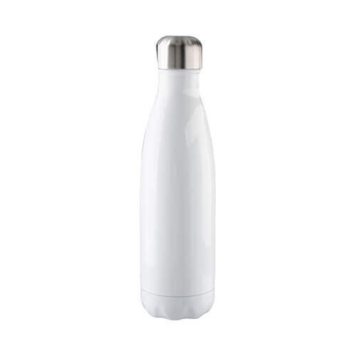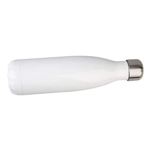 Borraccia bevande da 500 ml, con cannuccia, rivestita con uno strato di poliestere da sublimare. Il corpo della borraccia è in metallo, la chiusura in metallo e plastica.