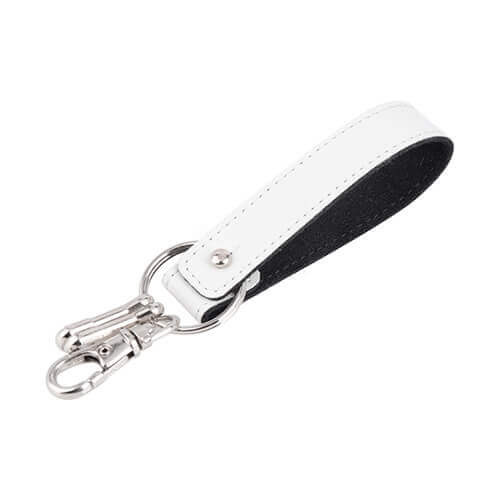 Portachiavi in pelle per la stampa a sublimazione. Il lato stampabile è di colore bianco, l’atro lato è di colore nero.