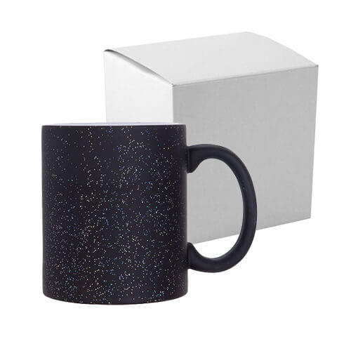 Tazza in ceramica, magica, nera, opaca con glitter, classe A+ / guarda come le ceramiche di questa classe differiscono dalle altre / per la stampa a sublimazione con una scatola di cartone.