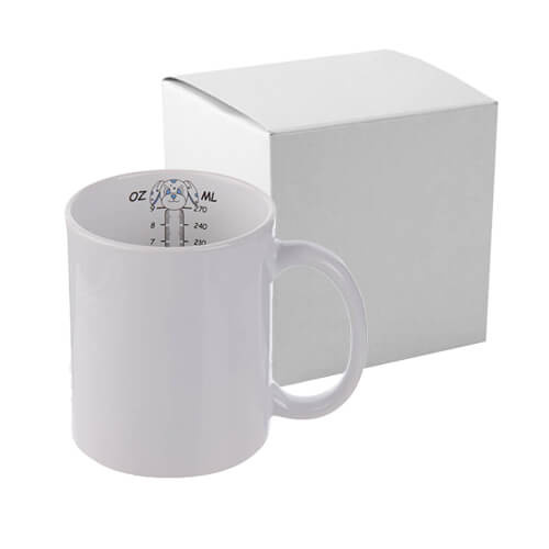 Tazza in ceramica con misura interna A+ rivestito con uno strato di poliestere per la stampa a sublimazione, con una scatola di cartone.