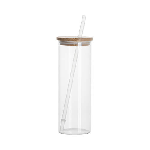 Una tazza con coperchio in bambù e cannuccia per la stampa a sublimazione.