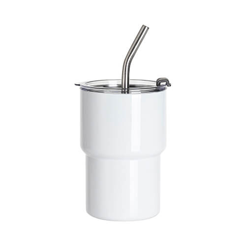 Tazza in acciaio inox a doppia parete, coperchio in plastica e cannuccia.