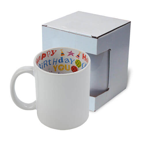 Tazza in ceramica con interno Happy Birthday, della classe A+ /vedi le differenze con altre classi di ceramica/ trattato con poliestere per renderlo adatto alla stampa a sublimazione. Possibilità di acquisto di un pezzo. Tazza con la scatola.