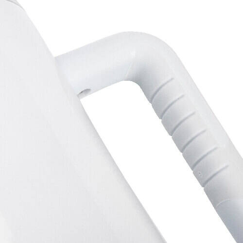 Tazza termica, in metallo a doppia parete con cannuccia e manico bianco.