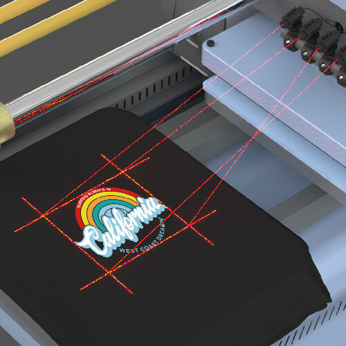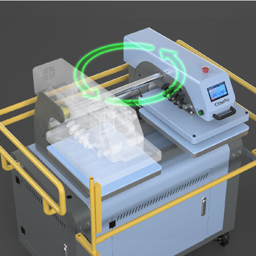 Sistema pneumatico automatico con compressore d'aria integrato. Posizionamento preciso a infrarossi. Traslazione e stampa automatica. Barriera di sicurezza intorno alla pressa termica. Dotato di 4 ruote piroettanti, facile da spostare.