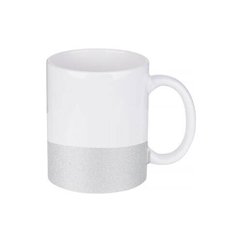 Tazza bianco in ceramica con una striscia glitter argento della classe A+ /vedi le differenze con altre classi di ceramica/, trattato con poliestere per renderlo adatto alla stampa a sublimazione. Possibilità di acquisto di un pezzo. Tazza con la scatola.